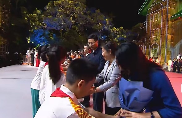“百名教师走红毯”是晚会的一个特别环节。晚会邀请了中大各培养单位及附属学校的教师代表们走上舞台,向一代代育梦成光的中大教师表达崇高敬意。