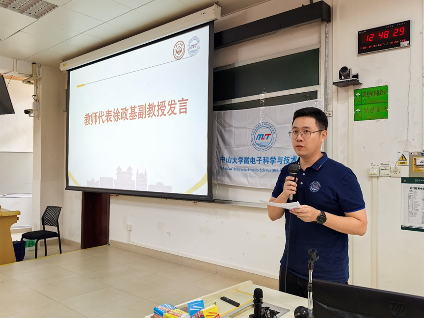 随后,教师代表徐政基发言。他结合自身多年的教学和科研经验,向新生们分享了学习微电子科学与技术的方法和心得,并鼓励同学们在大学期间要勇于探索、敢于创新,不断提升自己的专业素养和实践能力。