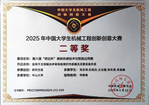 研究生组 | 应用于无接触光声缺陷检测的传感器及成像系统开发 | 柯晴青 | 张志清,杜侃杰,王治国,李东原,李昊峻 | 全国二等奖 |