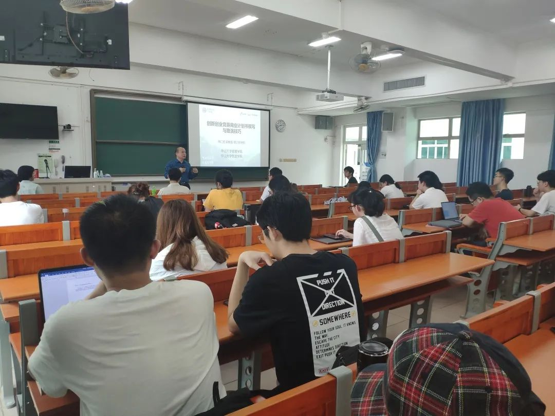 紧接着,朱教授就创新创业竞赛商业计划书的撰写向同学们介绍了相关知识。他从商业计划书的基本认识出发,带领同学们了解写作的基本结构,并从内容和框架两个方面详细解读了商业计划书的写作要领。提及出色创业计划书的核心内容时,他从产品、市场竞争分析等六个角度入手,辅以生动的案例向同学们说明了制作出色的创业计划书的重要性。最后,他从时间控制、内容控制和路演的逻辑和方法三个方面讲解了项目路演的基本技巧,并鼓励同学们积极尝试,锻炼自己的能力,为将来的创新创业打下良好的基础。讲座结束后,现场掌声雷动。