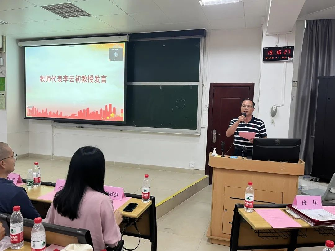 接下来是教师代表李云初教授致辞。李云初教授以九十一年前的今天在东北沈阳发生的九一八事变告诫同学们铭记历史,勿忘国耻,一代人有一代人的责任,一代人有一代人的使命。他希望同学们在中山大学微电子科学与技术学院这一平台能逐步完善自我、提高素质、学习专业知识、培养创新能力,并对同学们提出两点期望:第一要胸怀天下,志向高远;第二是提高能力,善于学习。最后,李云初教授给予同学们最美好的祝愿,希望同学们用自己的知识和智慧照亮前程,谱写人生新华章。