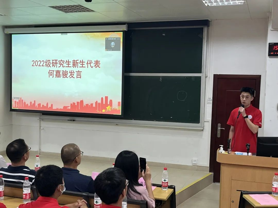 2022级研究生新生代表何嘉骏发言。他表达了来到中山大学微电子科学与技术学院的欣喜与自豪,鼓励同学们对自己提出更高的学习要求,秉持学术精神,主动学习、刻苦钻研;懂得兼收并蓄,厚积薄发;同时重视道德修养,巩固自己正确的人生观和世界观,勤勤恳恳做事,踏踏实实做人。他希望大一同学们能在丰富多彩的大学生活中学会合理安排时间,在学业上迎难而上,成为对国家有用的人才,为祖国的繁荣发展贡献自己的一份力量。