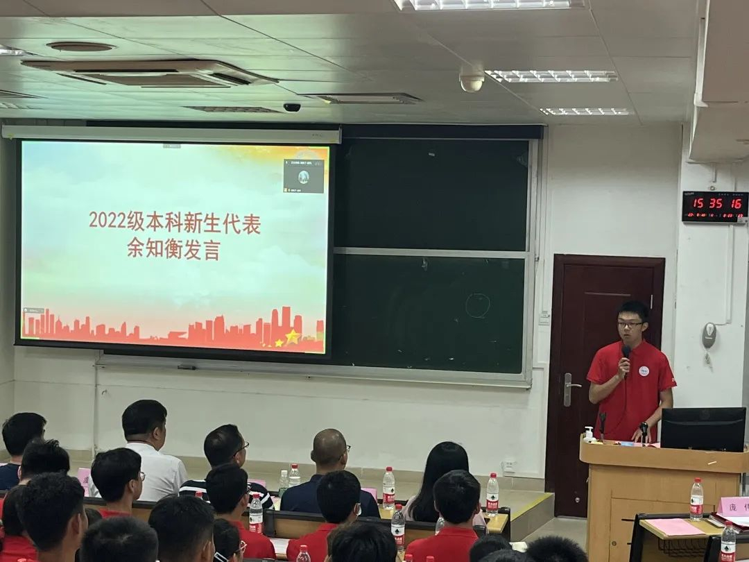 2022级本科新生代表余知衡发言。他分享了来到中大半个月以来的感受以及对未来的展望。他感受到应利用好大学生活的“自由”,敢想敢做,蜕变为一个更优秀的自己。他与各位新同学共勉,以自己担任临时负责人和副排长的经历鼓励大家勇敢面对全新的大学生活,勇于尝试,敢于探索未知领域,不惧改变;秉持坚忍不拔的毅力,将好学精神在微电子学院发扬光大,希望大家能树立远大的理想,怀揣崇高的抱负为微电子行业的发展做出自己的一份贡献。